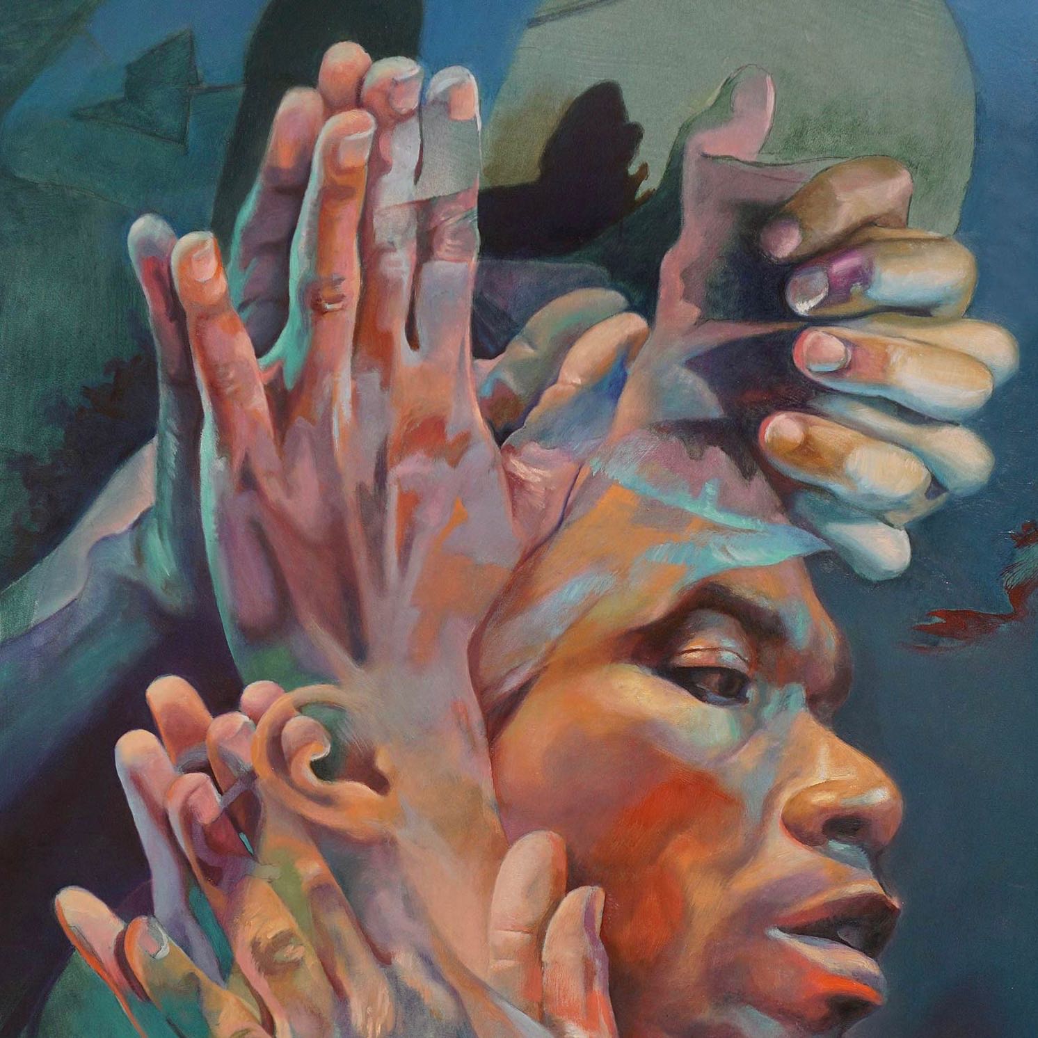 Detail of an oil painting on aluminum of hand surrounding a face